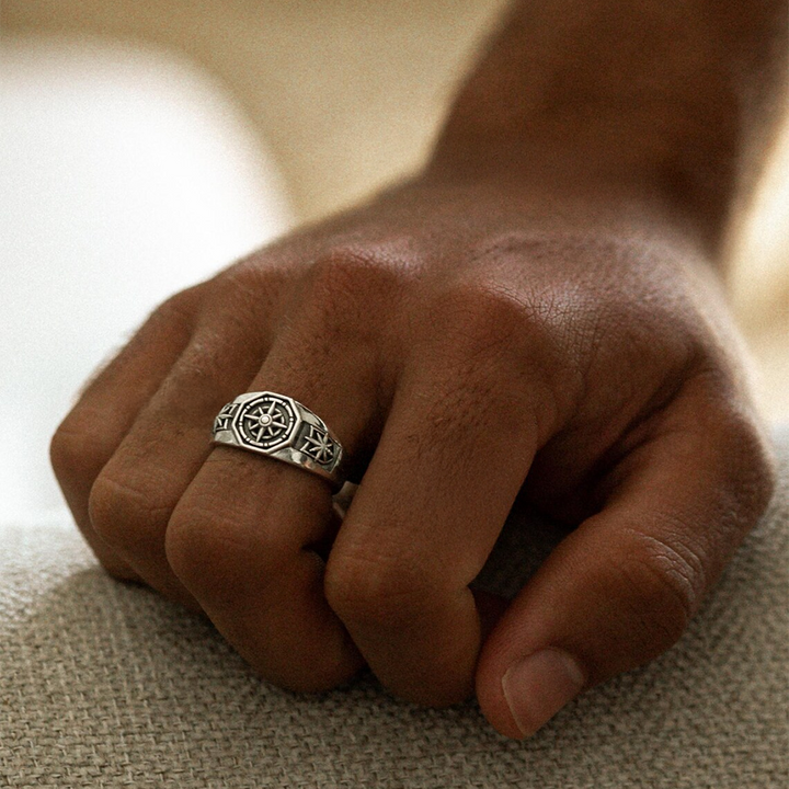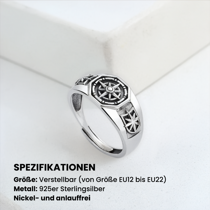 Dieser wunderschön gearbeitete Kompass-Ring ist mehr als nur Schmuck - er ist ein Symbol für Orientierung, Stärke und Verbundenheit.