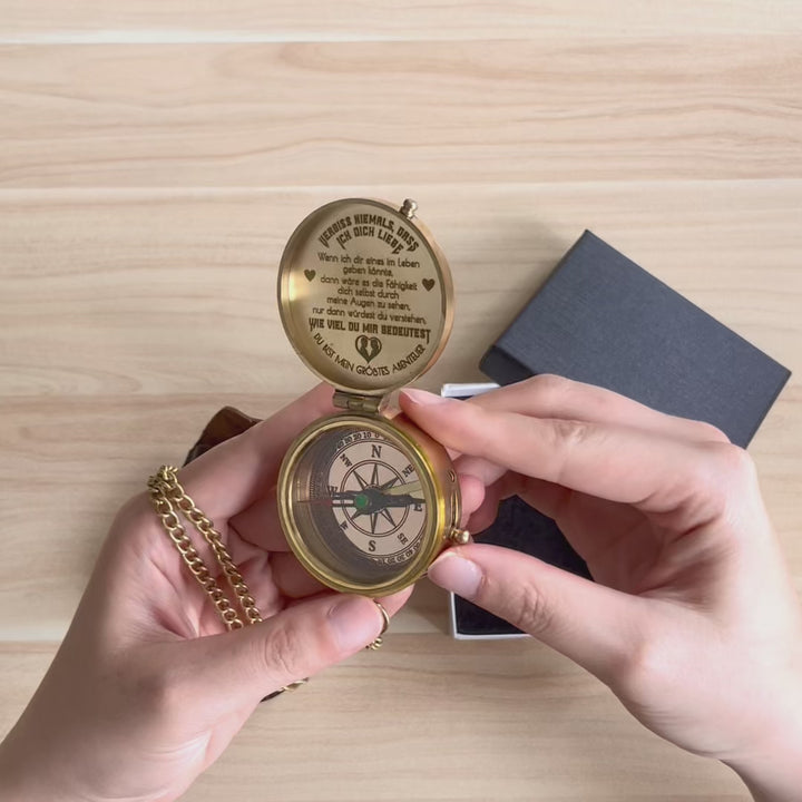 Dieser altmodische Kompass besteht aus langlebigem Messingmaterial und wurde sorgfältig poliert, um ihn zum Glänzen zu bringen. Die auf dem Kompass wunderschön lasergravierte Nachricht wurde speziell für Sie entworfen, um Ihre Liebe auf die subtilste Weise auszudrücken.