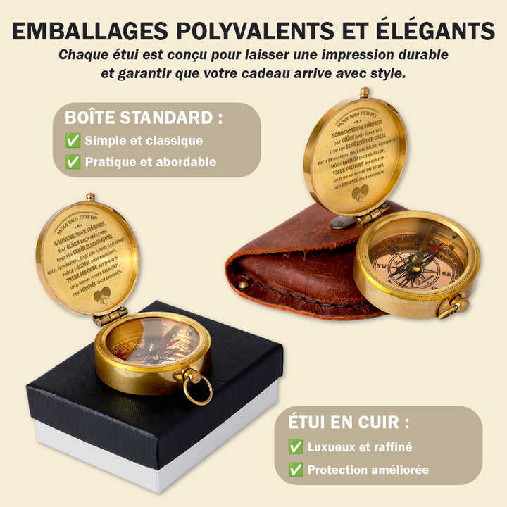 Dieser altmodische Kompass besteht aus langlebigem Messingmaterial und wurde sorgfältig poliert, um ihn zum Glänzen zu bringen. Die auf dem Kompass wunderschön lasergravierte Nachricht wurde speziell für Sie entworfen, um Ihre Liebe auf die subtilste Weise auszudrücken.