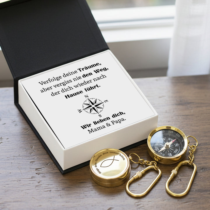 Dieser gravierte Kompass-Schlüsselanhänger aus Messing ist mehr als nur ein Geschenk – er ist ein Symbol für Liebe, Orientierung und bleibende Erinnerungen. Ein zeitloses Andenken, das Ihr Kind ein Leben lang begleitet – als Erinnerung daran, woher sie kommen und wer immer an sie glaubt.